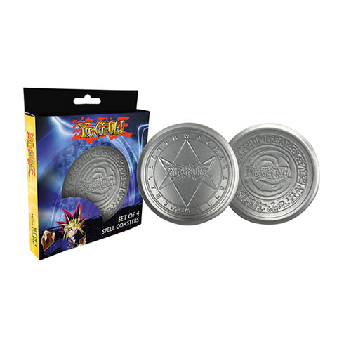 Set of 4 intricately embossed coasters featuring images from the hit Yu Gi Oh Series. With a fantastic non-slip cork base to protect your table. The 4 coasters feature 2 fantastic embossed designs, and are 89mm in diameter.